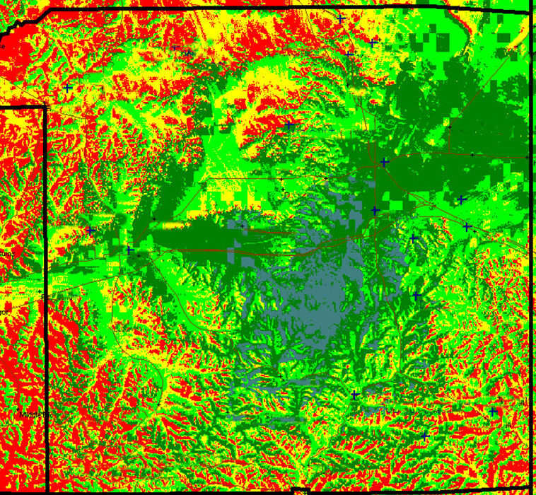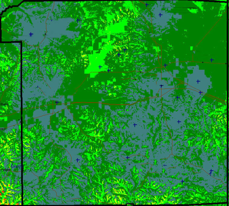 Areas in red show where there is no portable or pager coverage, and poor mobile coverage.